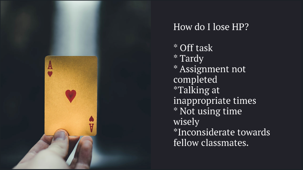 Solution: A new level of the game was added called Life Force. Every student started the game with 5 hearts (health points). If a negative behavior was observed the student lost a heart. If a student lost all 5 hearts they “fell into battle” and were removed from the game until a teacher designated date. After that date they were allowed to participate in the game once again. Added to digital google tracker for teachers.