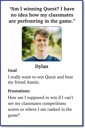 Solution: Created a Quest game website that students could access at anytime to answer any questions they have and to give them the ability to study the game to create their own strategies.