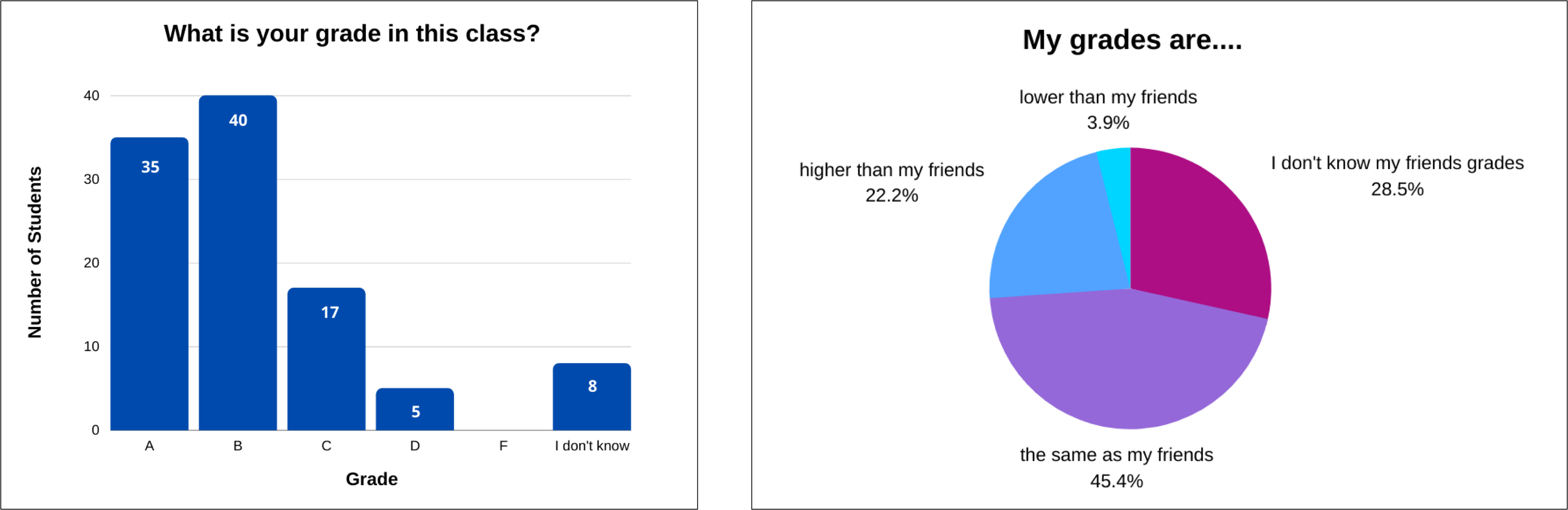 When asked about their current grades during the survey, 100% of students were aware of their scores, indicating that they care about their academic performance. Additionally, when inquired about their grades relative to their classmates, 72% of students knew whether their grades were higher, lower, or the same as their friends. This suggests that students are aware of and curious about their standing among peers, which may indicate a competitive nature.