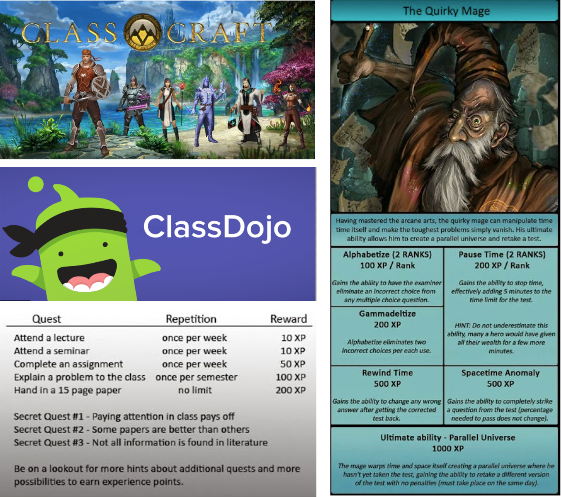 Research was conducted to explore what other teachers had done to address this issue. I discovered two digital tools aimed at student motivation: Class Craft and Class Dojo. However, both are designed for elementary and middle school students, which may not resonate with junior high students aged 15-16. Additionally, Class Craft was too expensive. This prompted further research beyond digital platforms, leading to the discovery of a college professor's blog who gamified his course by awarding XP points for various activities, allowing students to earn classroom privileges. While this was a promising concept, it needed to be adapted to meet the needs of junior high students, teachers, parents, and administrators in a public school setting.