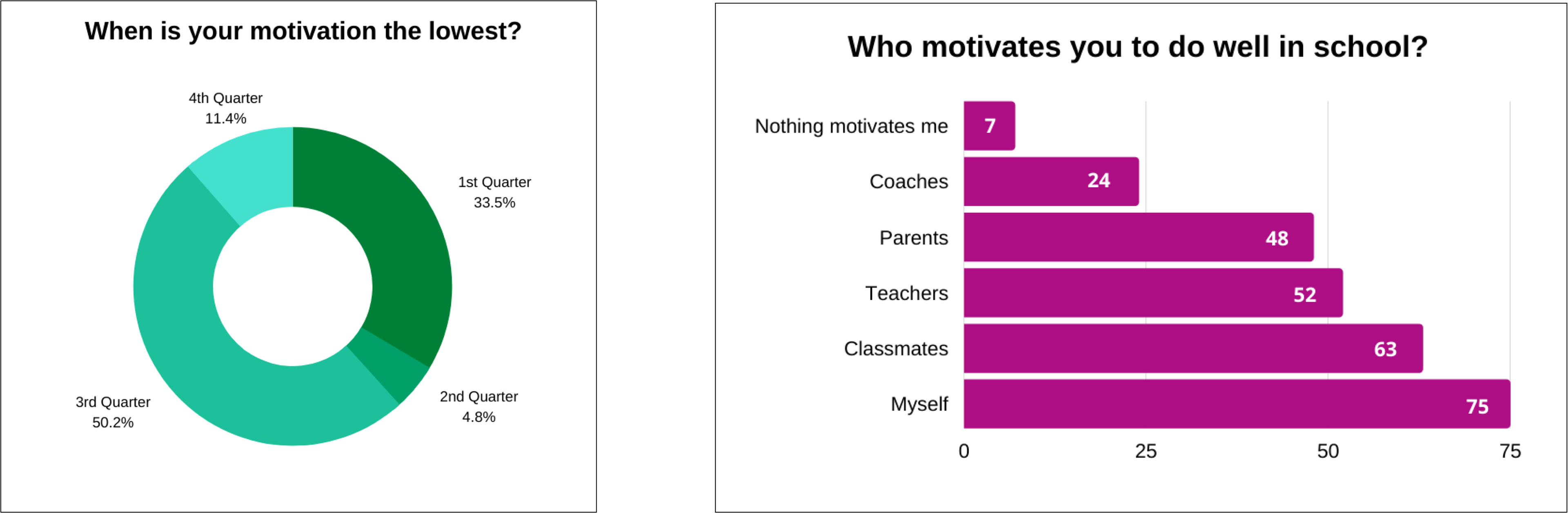 The incentive should be implemented during the 3rd quarter, as 50% of students reported that their motivation was at its lowest during this time. The top three factors motivating students were themselves, their classmates, and their teachers. Therefore, we need to design a solution that directly motivates students, fosters peer encouragement, and incorporates teacher support.