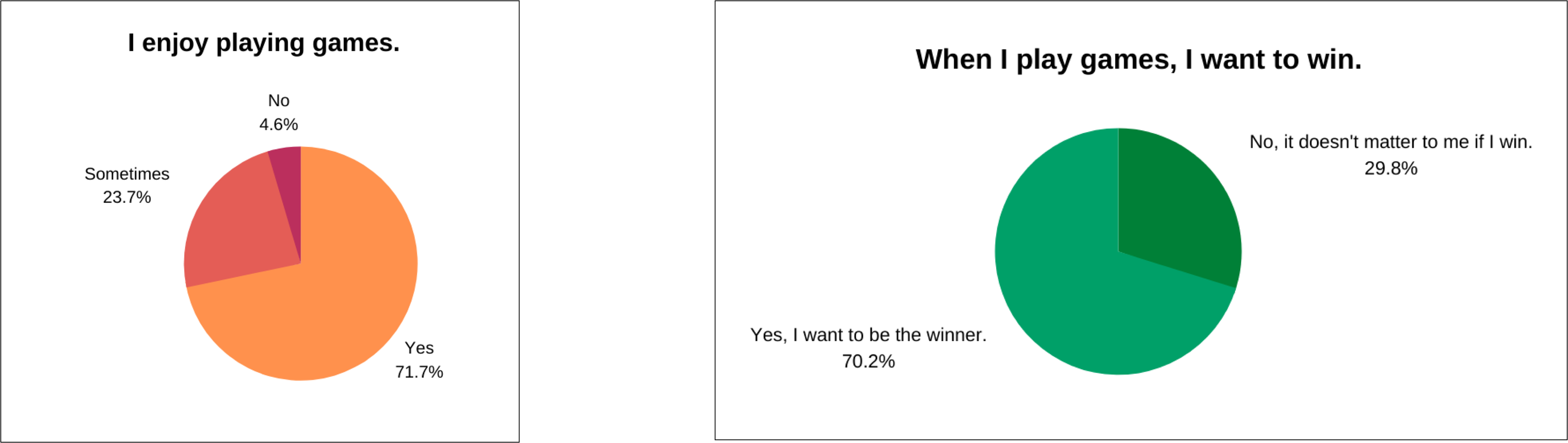 According to the survey, 95% of students reported enjoying playing games, while 70% said they play to win. These results indicate that students have a strong affinity for games, with many engaging in them due to their competitive nature.