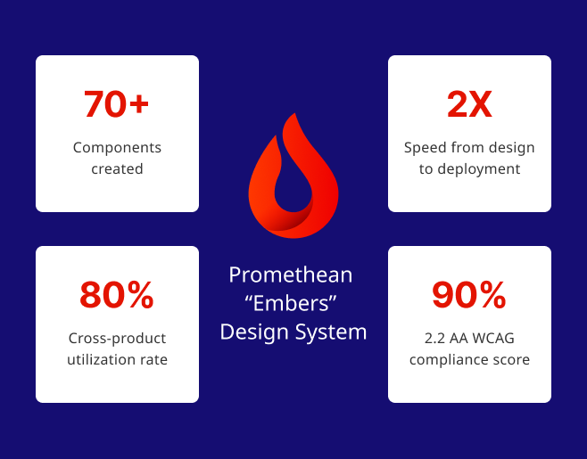 Co-created Embers, Promethean’s design system, which unified product experiences and led to a 50% reduction in build time, making the development process twice as efficient.
